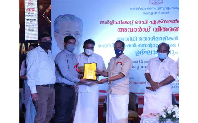 ഫോട്ടോ ക്യാപ്ഷന്- സംസ്ഥാന തൊഴില്, നൈപുണ്യ വകുപ്പിന്റെ 2019-ലെ സര്ട്ടിഫിക്കറ്റ് ഓഫ് എക്സലന്സ് മന്ത്രി ടി.പി. രാമകൃഷ്ണനില് നിന്ന് ശോഭ ലിമിറ്റഡ് റീജിയണല് അഡ്മിനിസ്ട്രേഷന് ഹെഡ് രാഹില് കെ.സി, പ്രോജക്ട് ഹെഡ് ജോഷ്കുമാര് എന്നിവര് ചേര്ന്ന് ഏറ്റുവാങ്ങുന്നു. മേയര് അനില്കുമാര്, ടി.ജെ. വിനോദ് എംഎല്എ എന്നിവര് സമീപം.