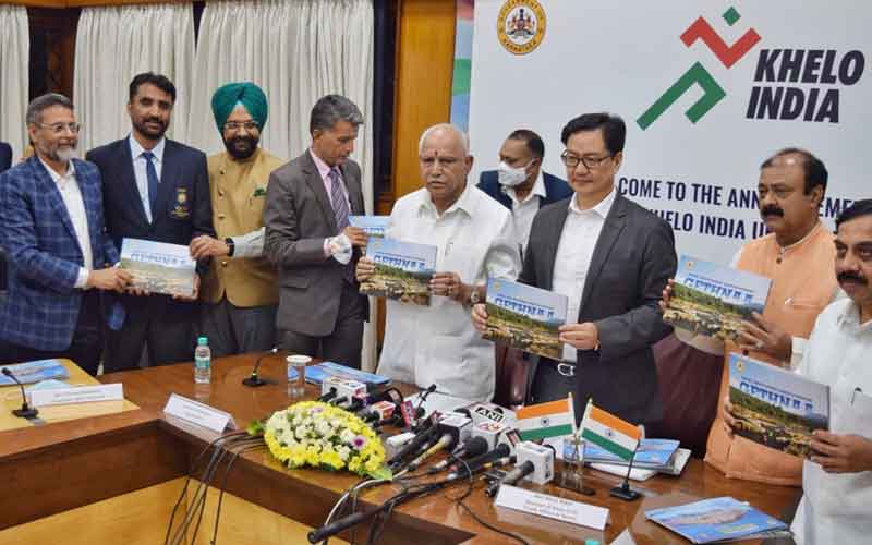 ഫോട്ടോ ക്യാപ്ഷന്- ഖേലോ ഇന്ത്യ യൂണിവേഴ്സിറ്റി ഗെയിംസിന്റെ വേദി പ്രഖ്യാപനം കേന്ദ്രമന്ത്രി കിരന് റിജിജുവും കര്ണാടക മുഖ്യമന്ത്രി ബി.എസ്. യെദിയൂരപ്പയും ചേര്ന്ന് നടത്തുന്നു.