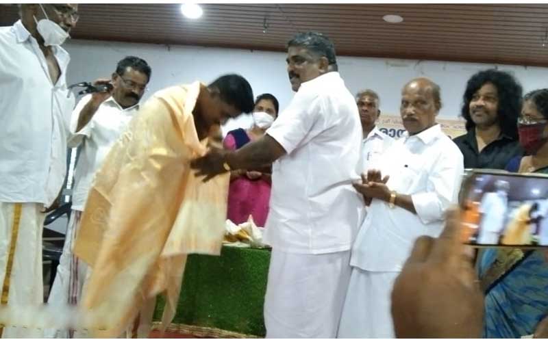 പ്രമുഖ വാസ്തു ശാസ്ത്ര വിദഗ്ദനു ക്ഷേത്ര ശിൽപ്പിയുമായ രാജേഷ് കേരളവർമ്മ ഇളയാചാരിയെ രാമദാസ് കതിരൂർ പൊന്നാടയണിയിച്ച് ആദരിക്കുന്നു